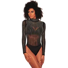 Buy Sexy Black Rhinestone Studded Mock Neck Bodysuit Women Long Sleeve Sheer Mesh Jumpsuits Sexy Club See Through Body Suit